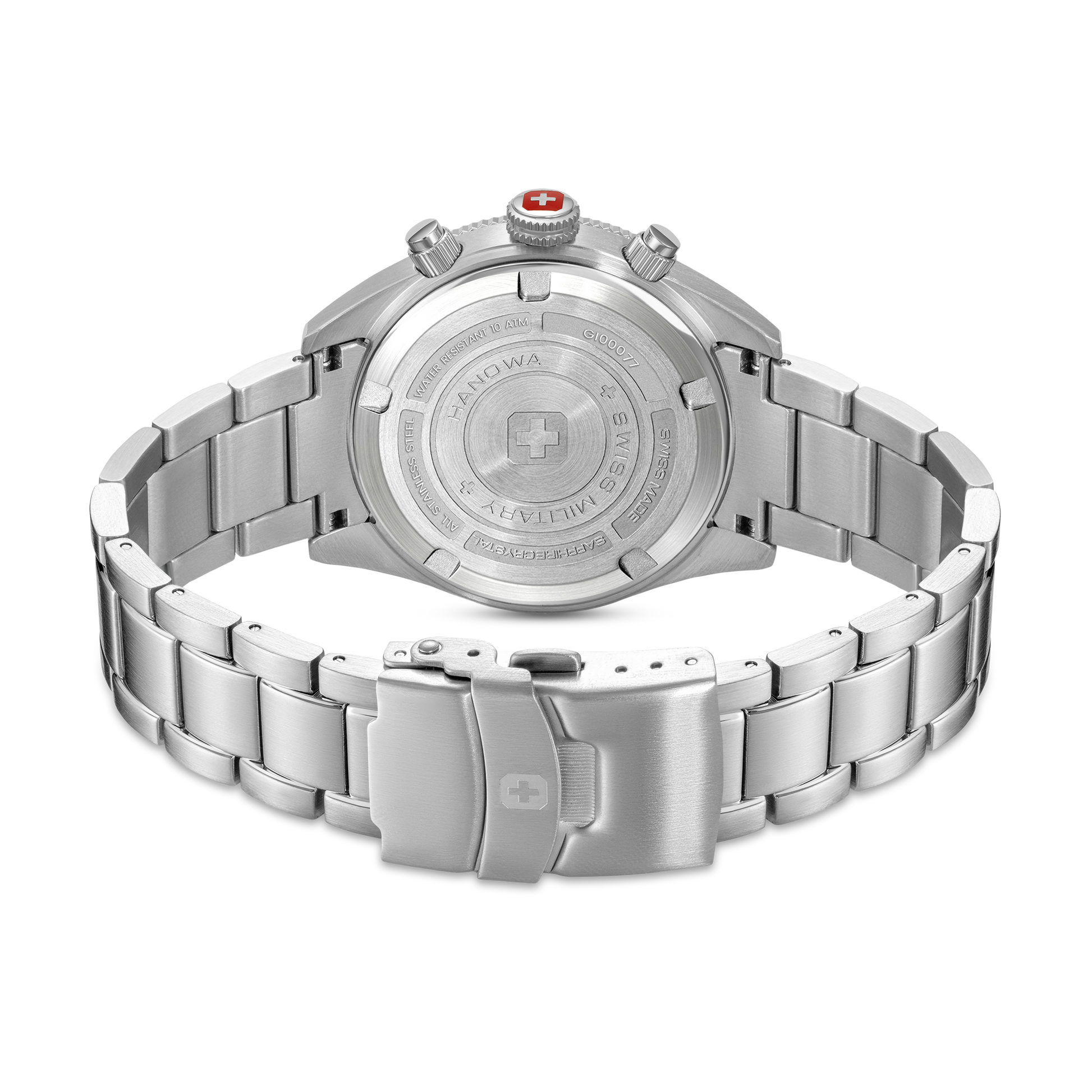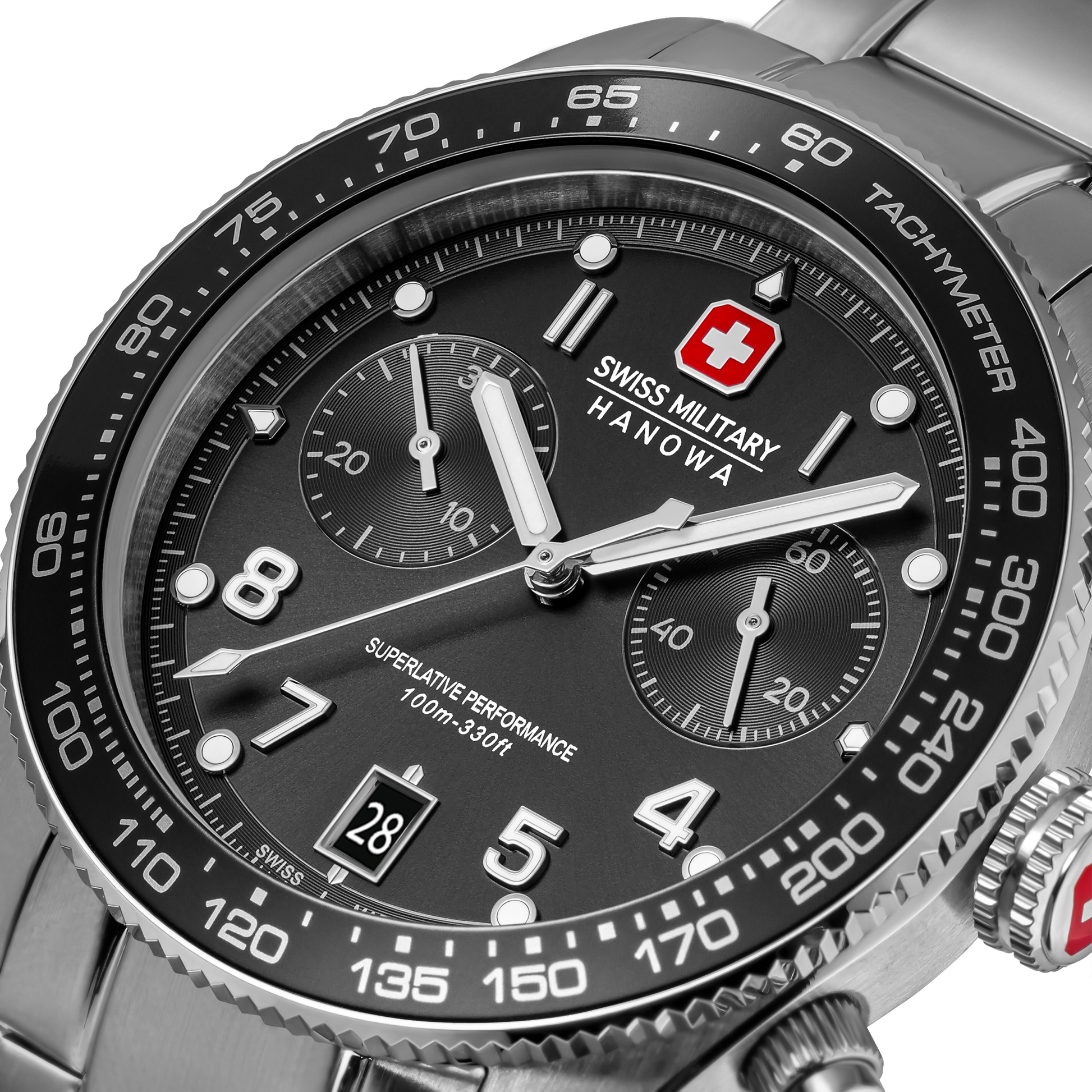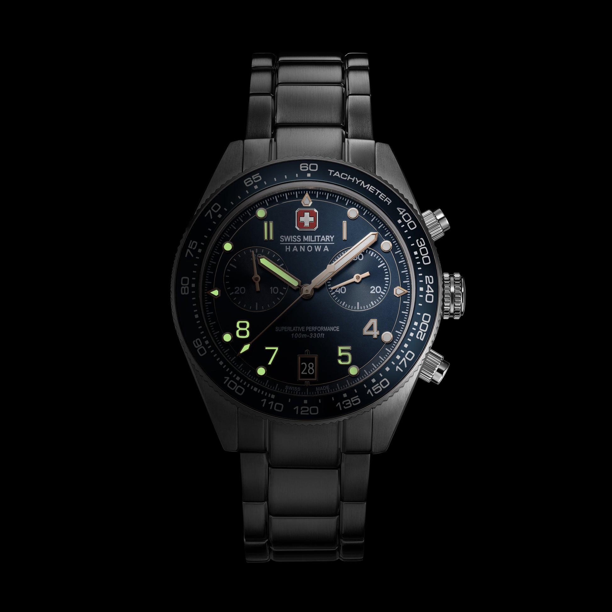 Der Spitfire Chronograph vereint markante Präzision mit moderner Eleganz. Das 43-mm-Edelstahlgehäuse rahmt ein tiefschwarzes Sunburst-Zifferblatt, dessen Lichtspiel Dynamik und Tiefe verleiht. Fein diamantgeschliffene Akzente betonen die drei Chronographenzähler und unterstreichen die technische Finesse dieses Modells. Aufgesetzte arabische Ziffern mit hochwertiger Leuchtbeschichtung garantieren optimale Ablesbarkeit bei Tag und Nacht, geschützt durch widerstandsfähiges Saphirglas. Mit Edelstahlarmband, 10 ATM Wasserdichtigkeit und zuverlässiger Chronographenleistung ist die Spitfire ein souveräner Begleiter für jede Situation.