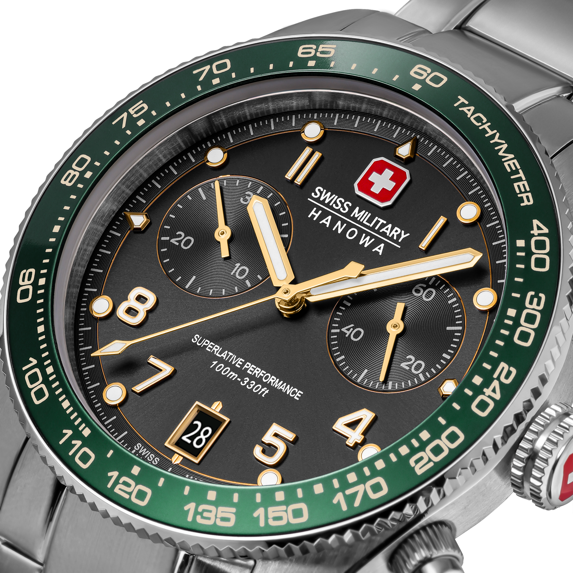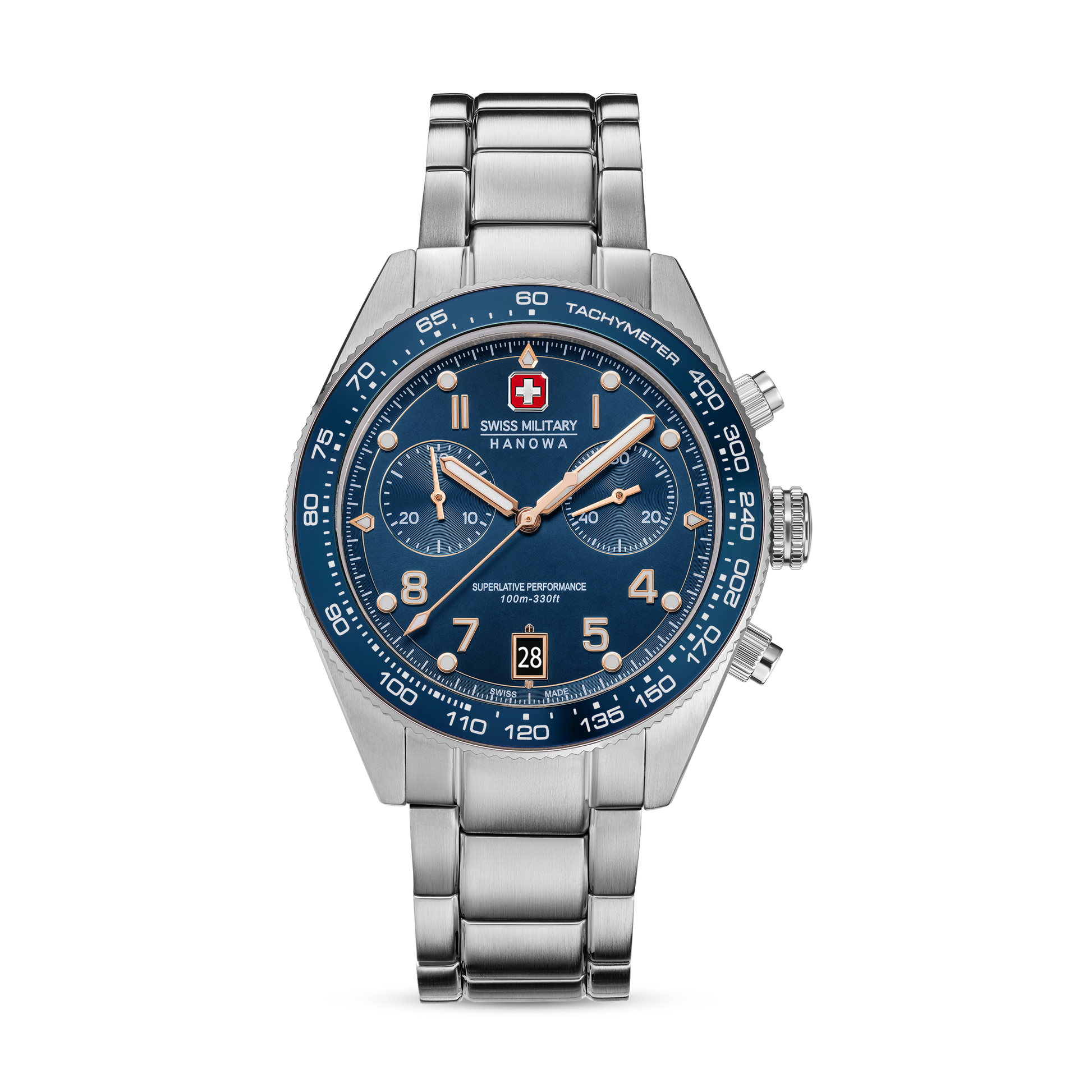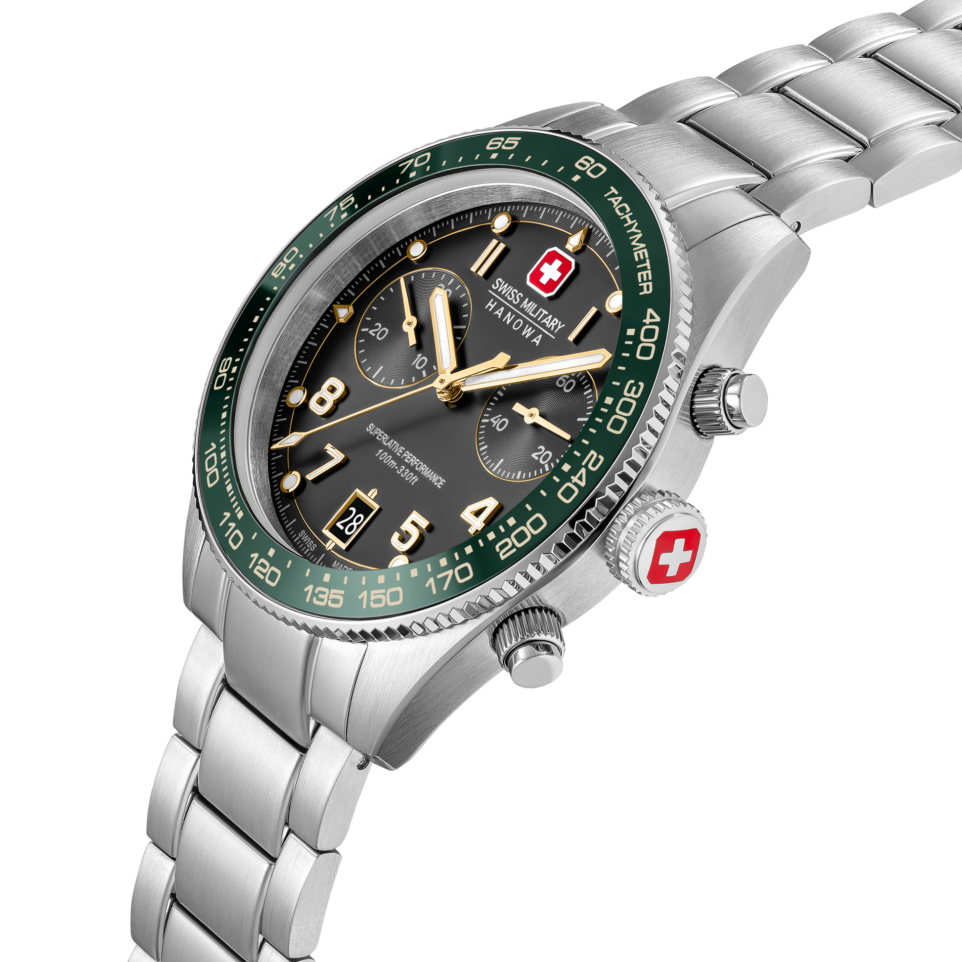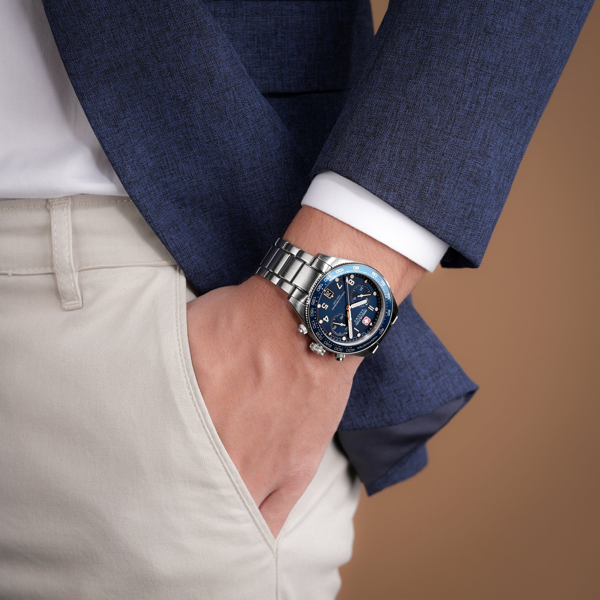 Der Spitfire Chronograph vereint markante Präzision mit moderner Eleganz. Das 43-mm-Edelstahlgehäuse rahmt ein tiefschwarzes Sunburst-Zifferblatt, dessen Lichtspiel Dynamik und Tiefe verleiht. Fein diamantgeschliffene Akzente betonen die drei Chronographenzähler und unterstreichen die technische Finesse dieses Modells. Aufgesetzte arabische Ziffern mit hochwertiger Leuchtbeschichtung garantieren optimale Ablesbarkeit bei Tag und Nacht, geschützt durch widerstandsfähiges Saphirglas. Mit Edelstahlarmband, 10 ATM Wasserdichtigkeit und zuverlässiger Chronographenleistung ist die Spitfire ein souveräner Begleiter für jede Situation.
