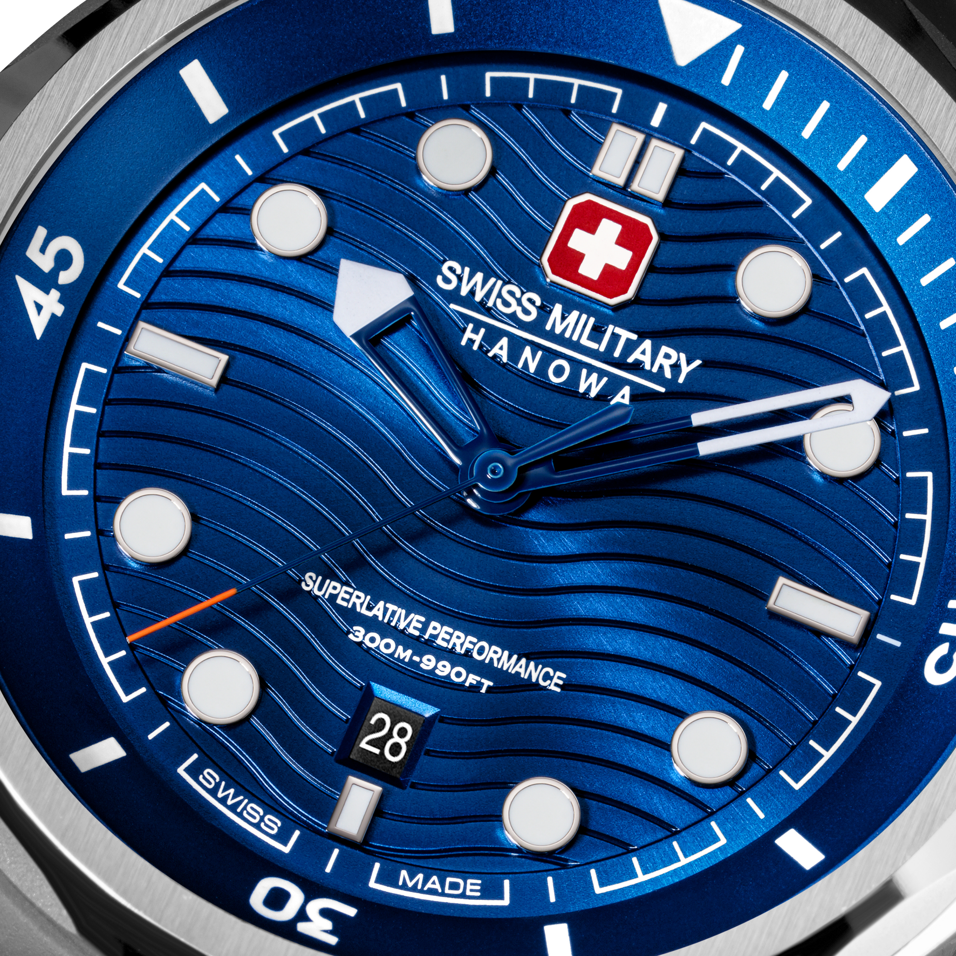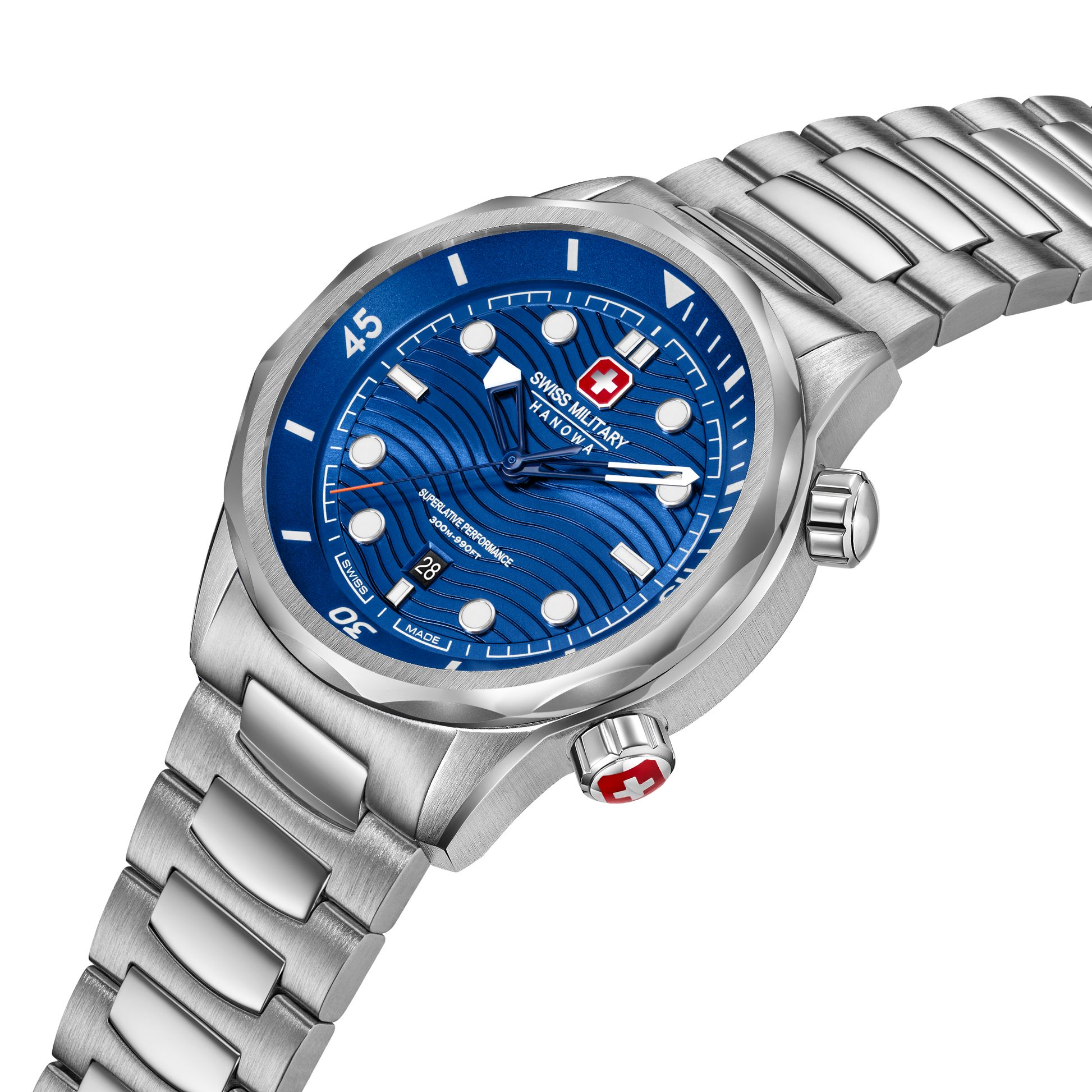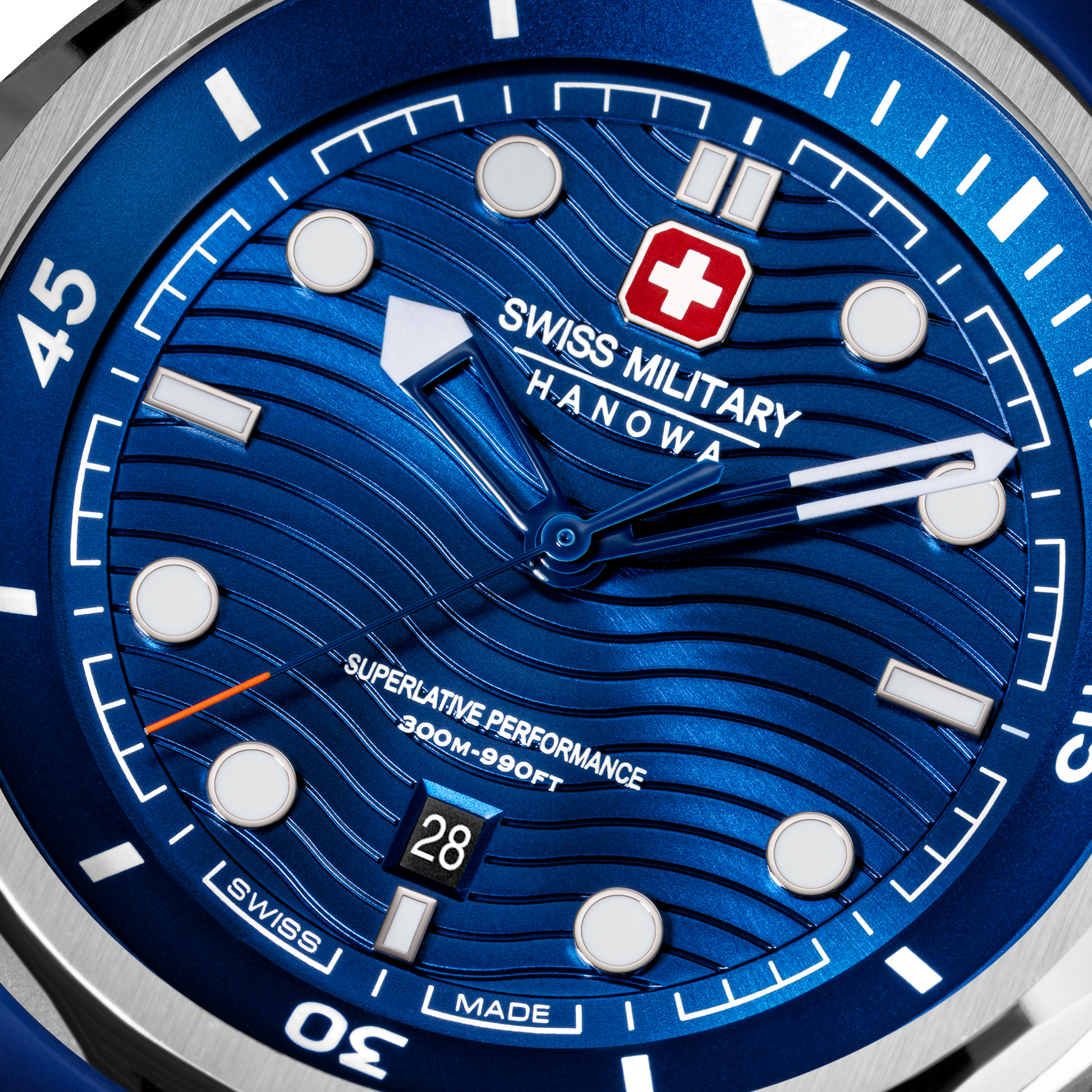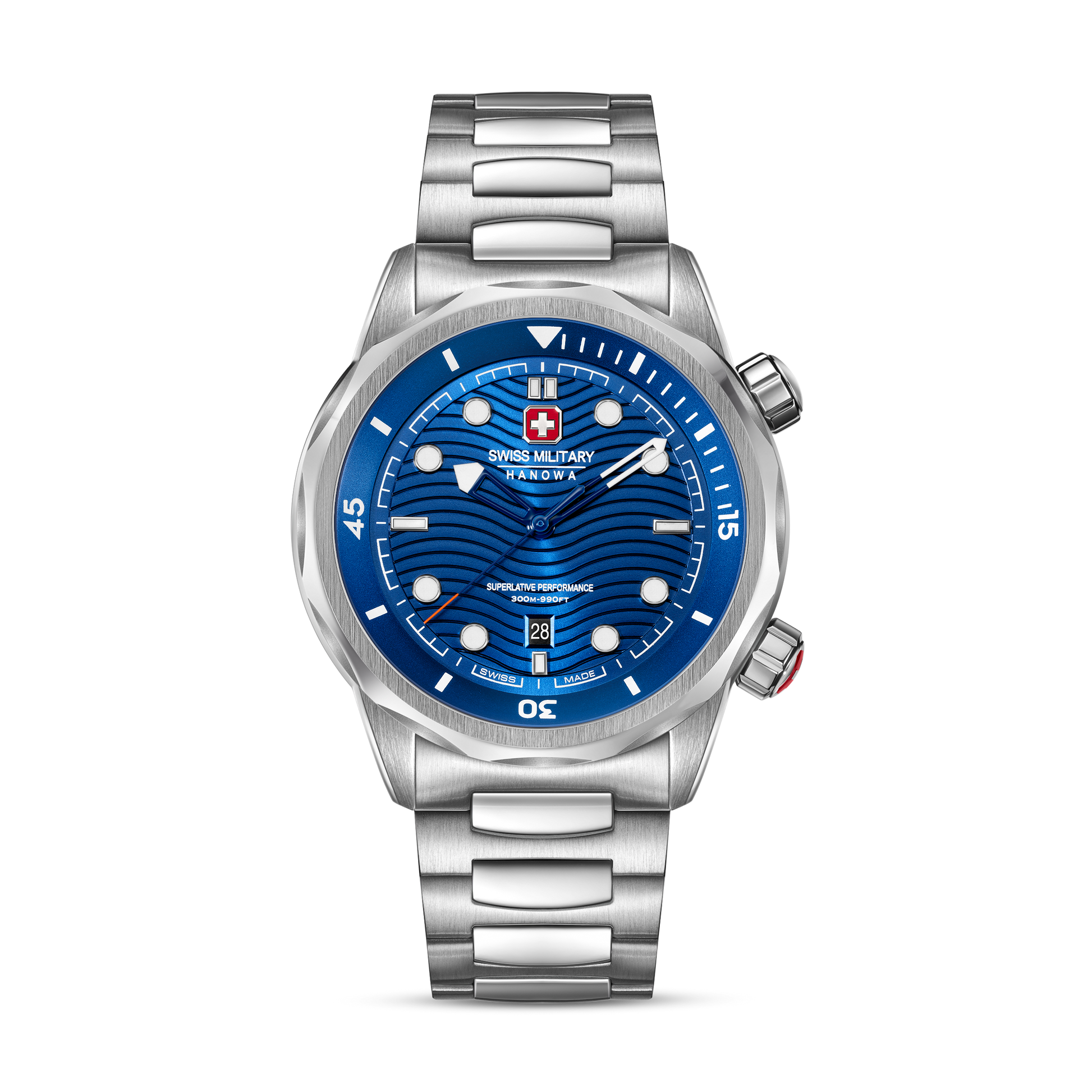 Built to conquer the depths – Swiss Military Hanowa introduces Breakwater. With a robust 43mm case and gradient blue dial featuring a wave pattern, this timepiece is as bold as it is functional. Two screw-down crowns - one for setting the time, the other for adjusting the diving time, give you precise control. Offering an impressive 30 ATM water resistance, the watch is engineered for adventure, while the silicone strap ensures all-day comfort and durability.