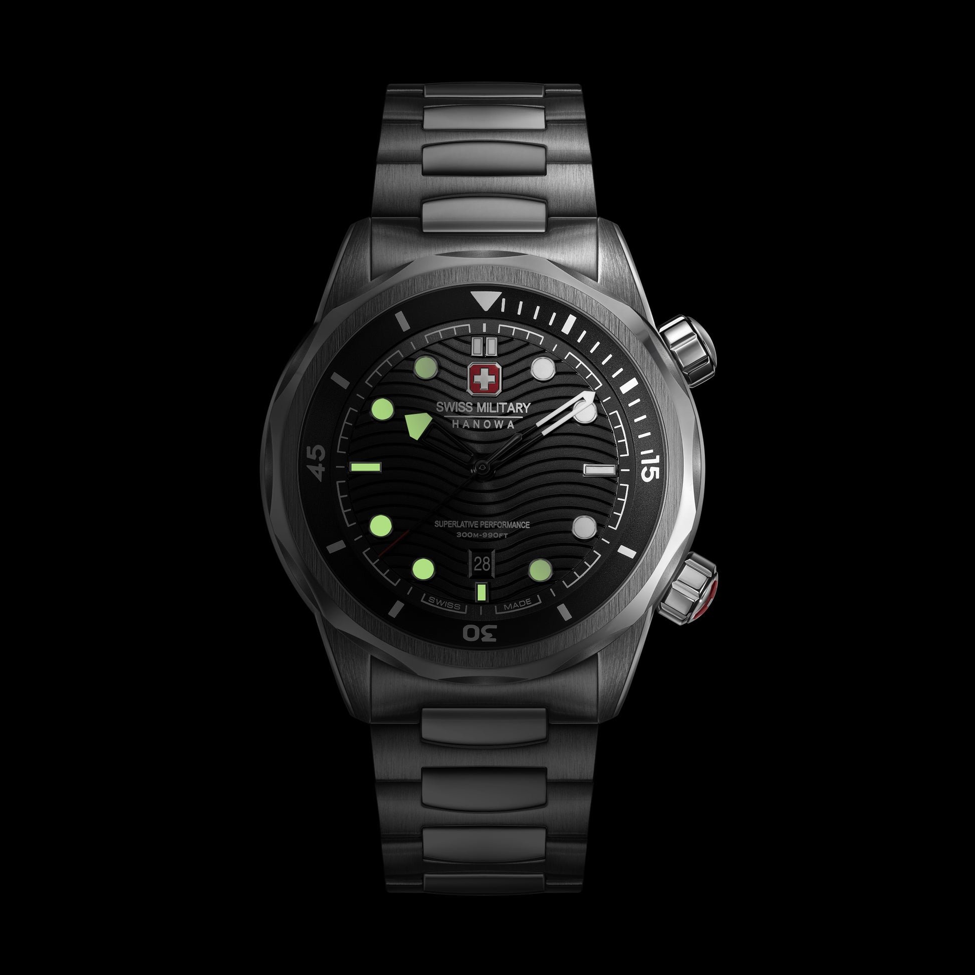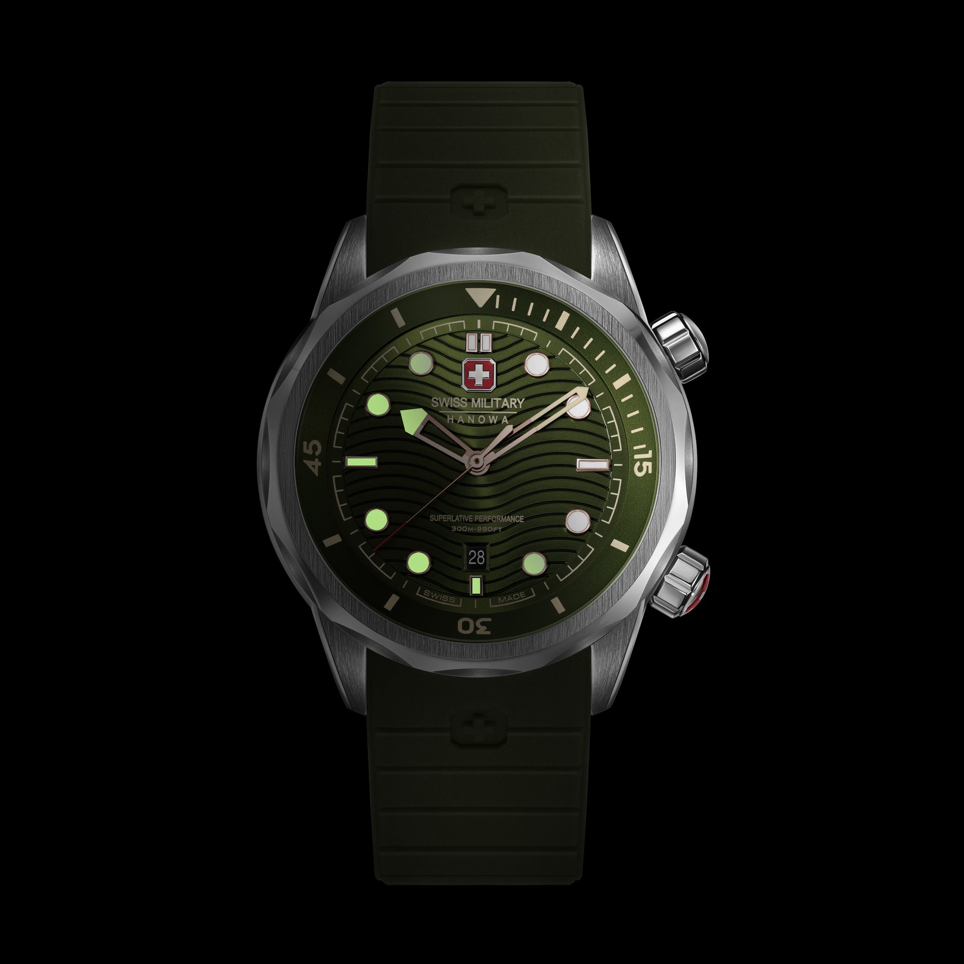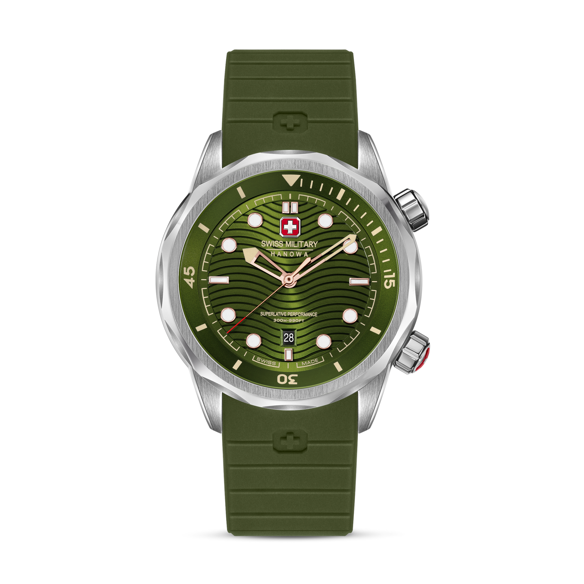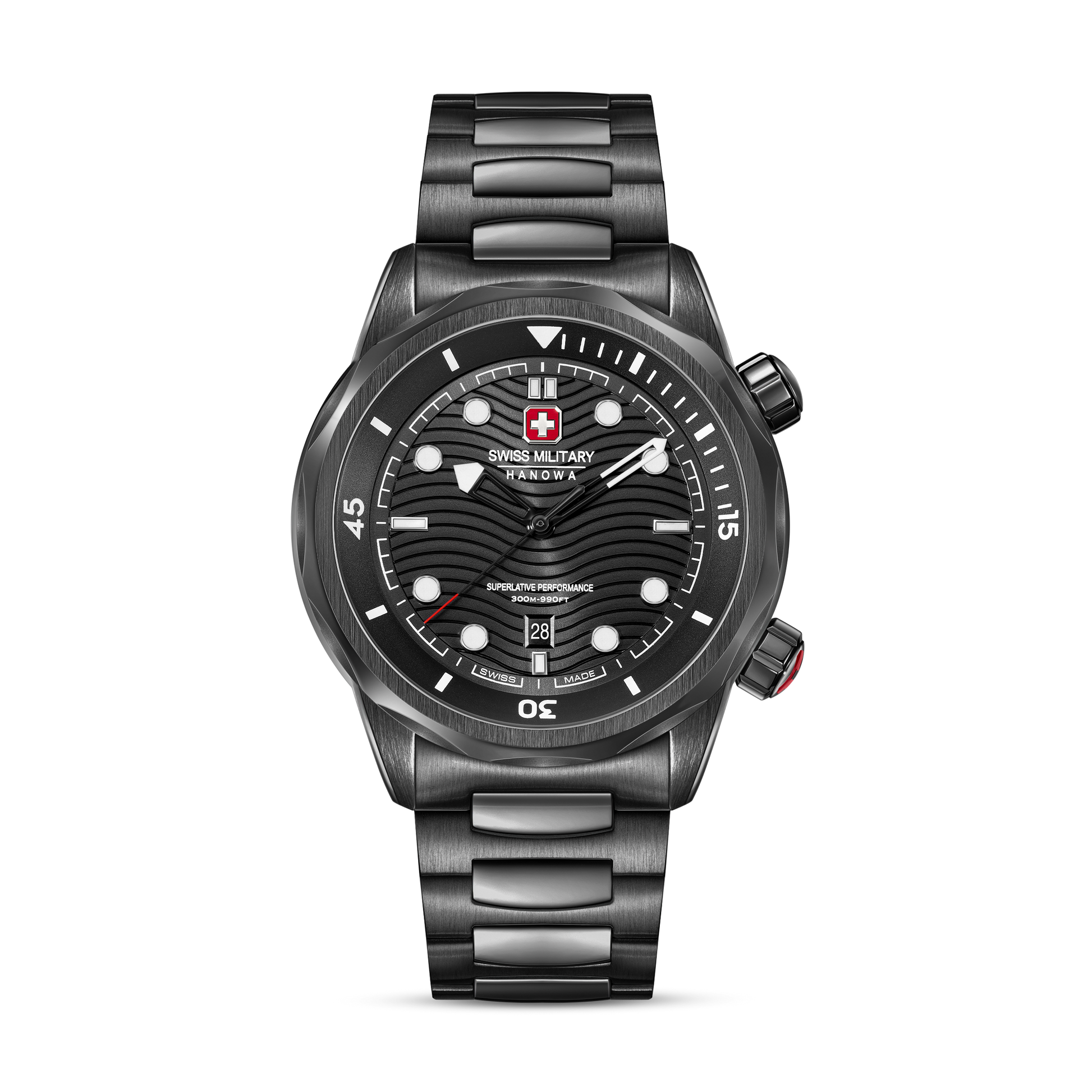 Built to conquer the depths – Swiss Military Hanowa introduces Breakwater. With a robust 43mm case and gradient blue dial featuring a wave pattern, this timepiece is as bold as it is functional. Two screw-down crowns - one for setting the time, the other for adjusting the diving time, give you precise control. Offering an impressive 30 ATM water resistance, the watch is engineered for adventure, while the silicone strap ensures all-day comfort and durability.