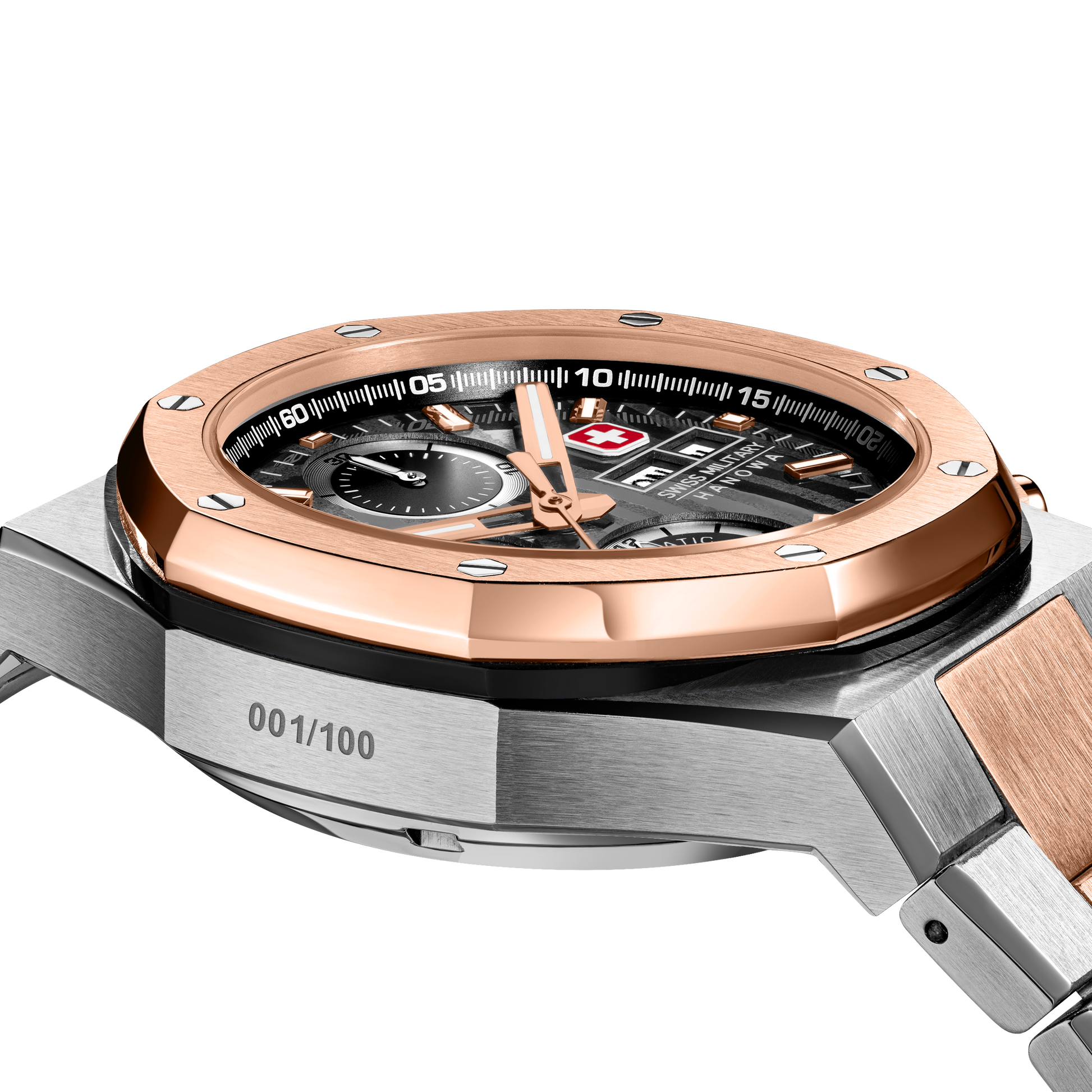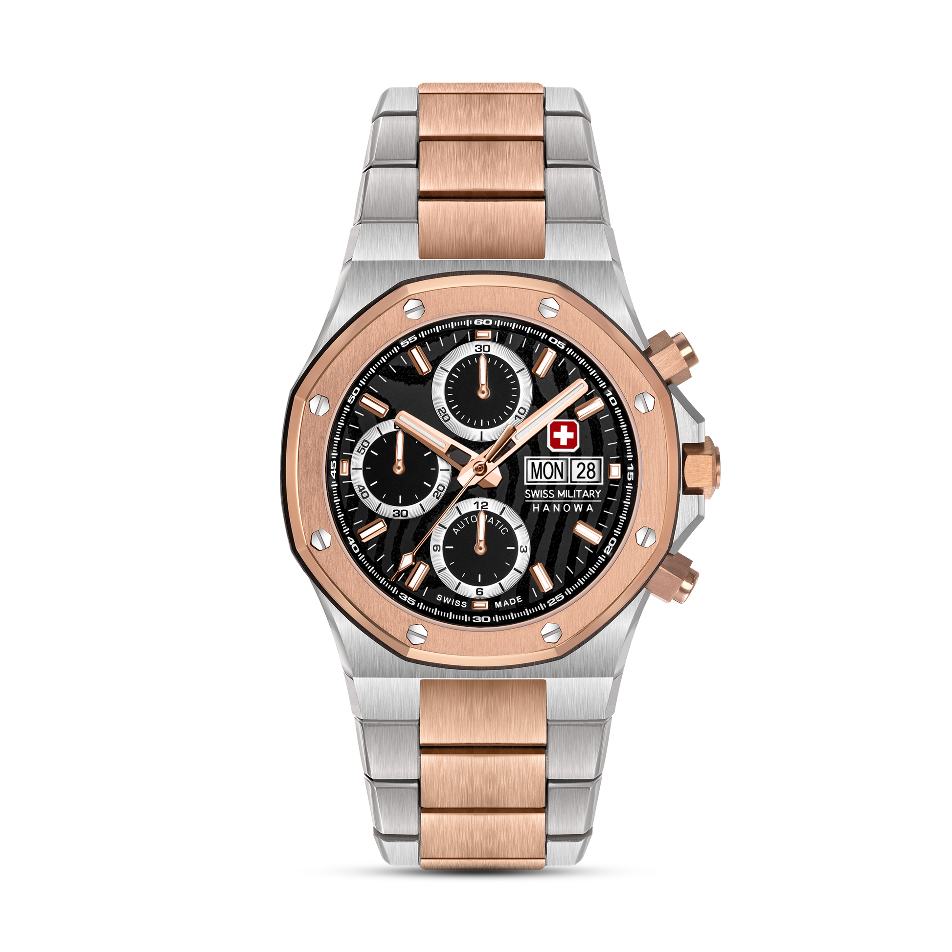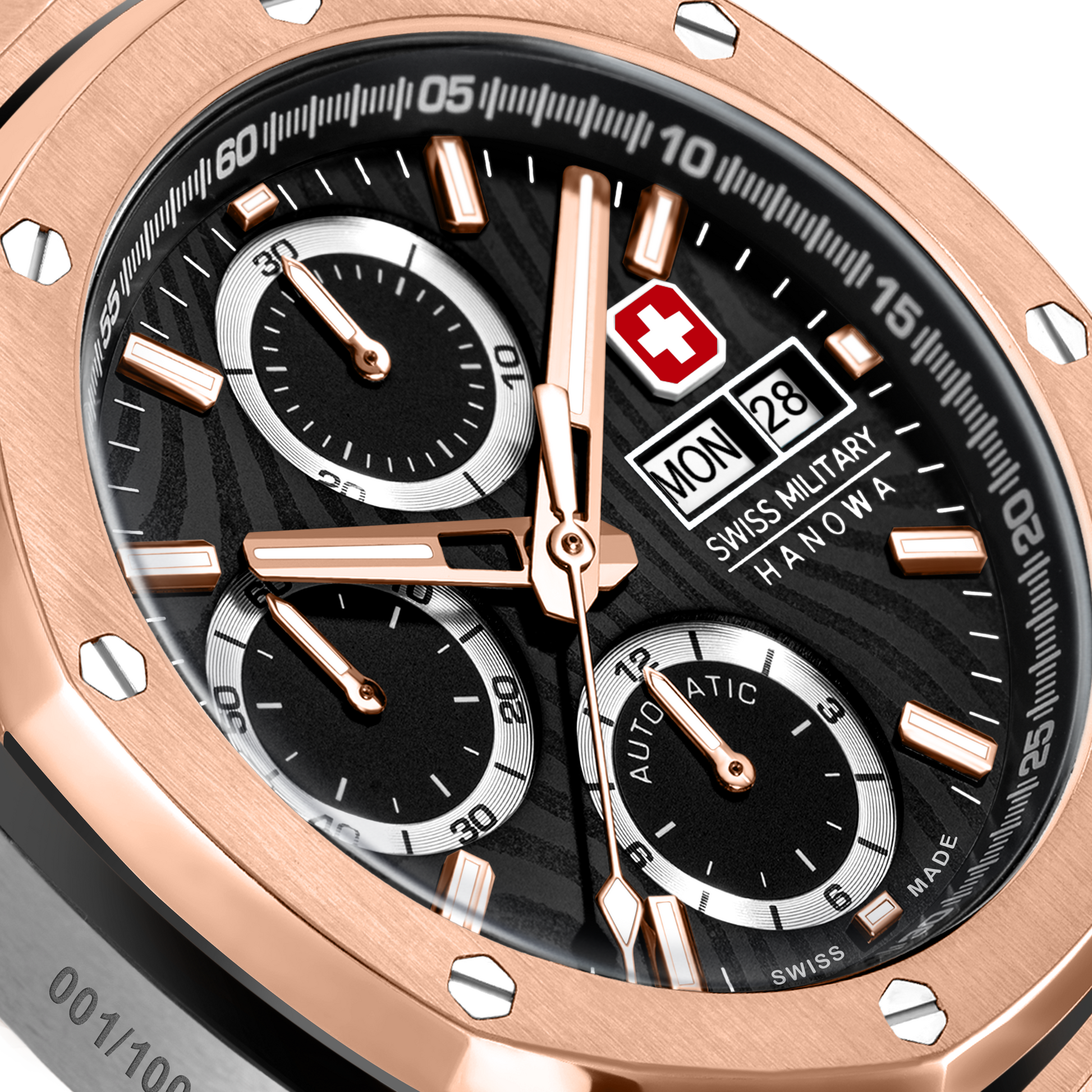 A force of nature. Swiss Military Hanowa Damask Legend - Fireball features grey Damascus-treated dial, contrasted with black subdials, capturing the essence of untamed energy. The 8-edged rose gold topring with screw details adds a striking accent, while the two-tone bracelet blends elegance with toughness. Limited and numbered, this Swiss Made ETA 7750 automatic chronograph features a sapphire crystal, screw-down crown and screw-down pushers, and 10 ATM water resistance - built for those who move with intensity.