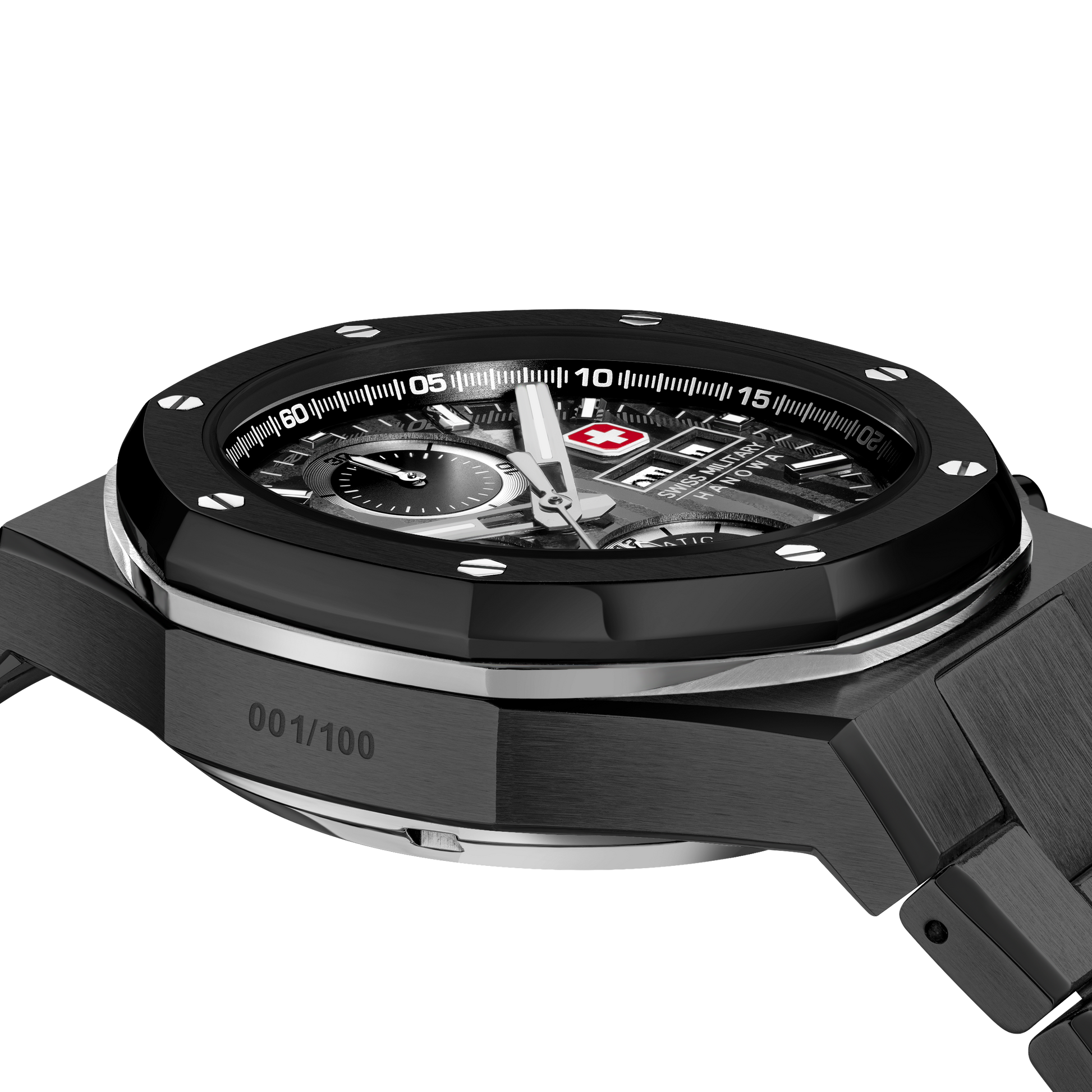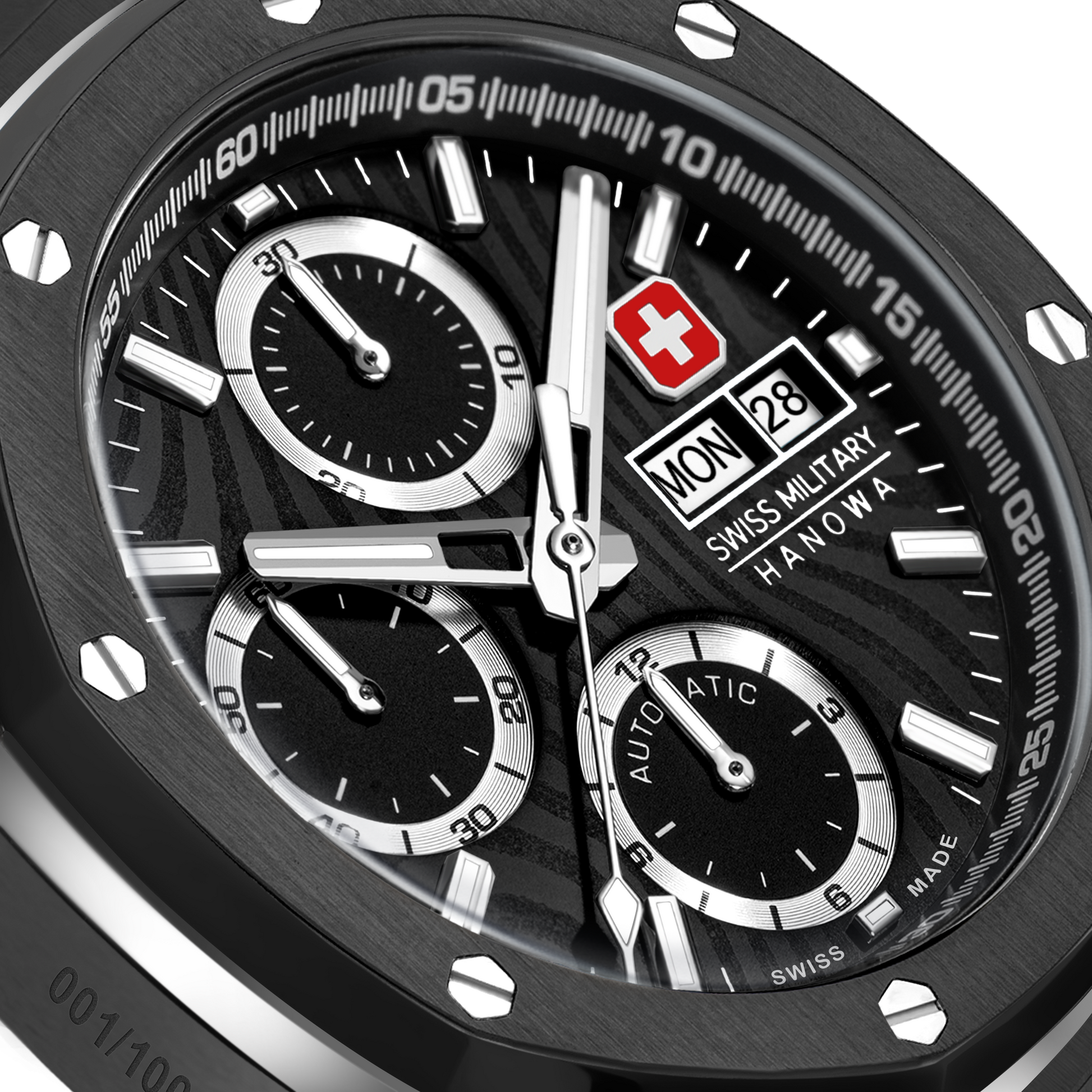 Fierce. Bold. Uncompromising. Swiss Military Hanowa Damask Legend - Ironblack is fully black, featuring an 8-edged topring with screw details for a rugged, industrial edge. Crafted using the intricate Damascus technique, the black dial delivers a one-of-a-kind texture. Powered by Swiss Made ETA 7750 an automatic chronograph movement, this limited and numbered edition timepiece is built for endurance with a screw-down crown and screw-down pushers, sapphire crystal, 10 ATM water resistance, and a see-through sapphire caseback.