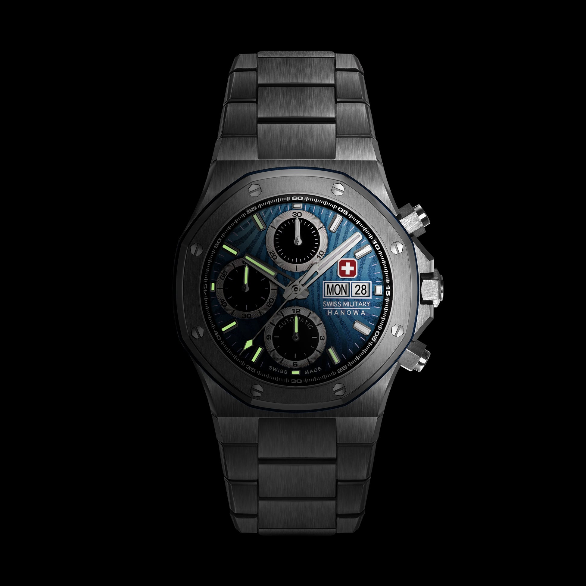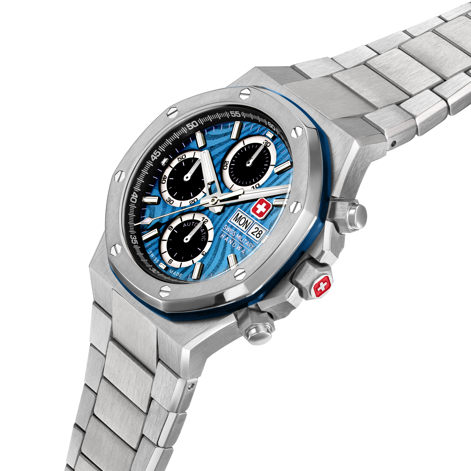 Swiss Military Hanowa Damask Legend – Windstorm, a limited and numbered edition, boasts a deep blue Damascus-treated dial, paired with black subdials, embodying power in motion. A testament to precision, this Swiss Made ETA 7750 automatic chronograph is designed for those who can withstand the forces of nature. The 42mm case, screw-down crown and screw-down pushers, sapphire crystal, and 10 ATM water resistance ensure durability, while the see-through sapphire caseback reveals the movement within.