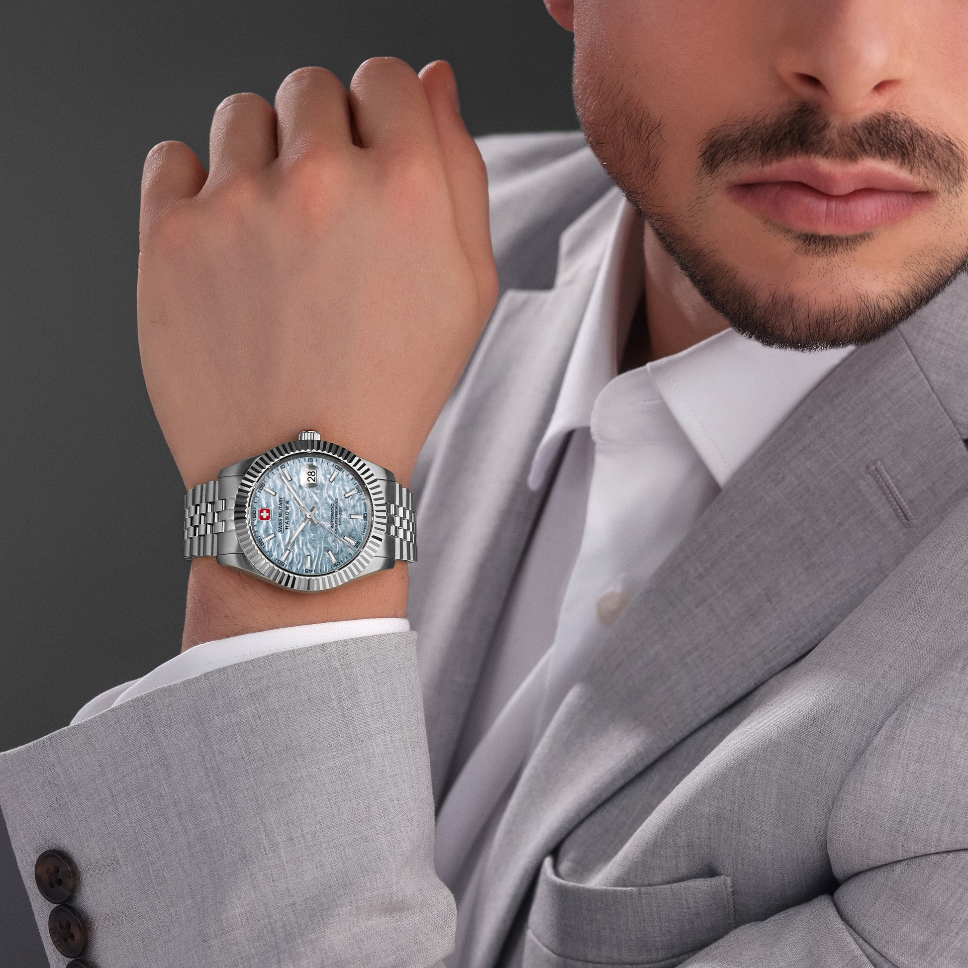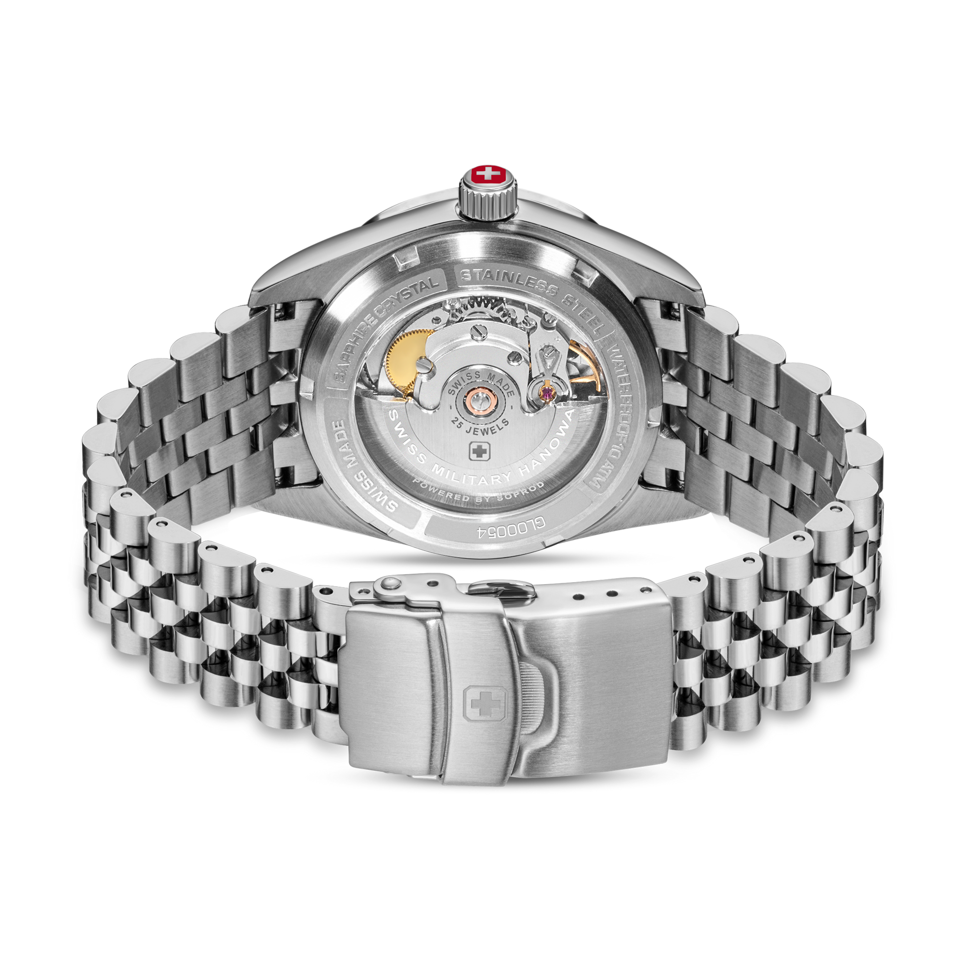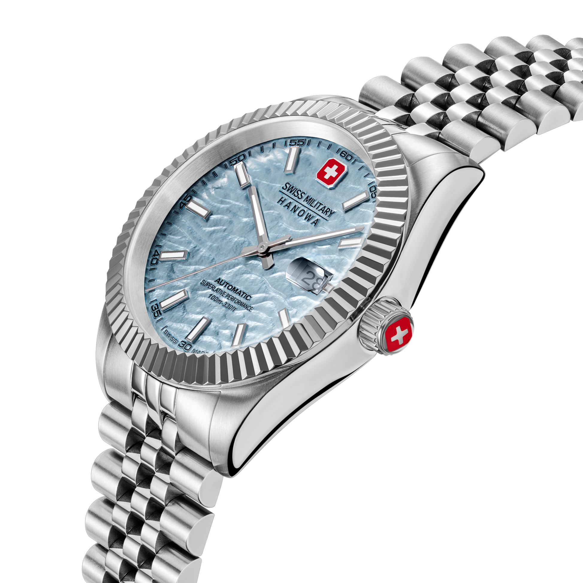 A fresh take on timeless elegance: Swiss Military Hanowa's Master Diligenter. This 41mm automatic timepiece features a sleek case with a fluted bezel, water-resistant up to 100 meters. Its textured silver dial captivates the eye, with a magnifying lens at 3 o’clock for easy date reading. Paired with a durable bracelet, this watch perfectly blends sophistication and performance.