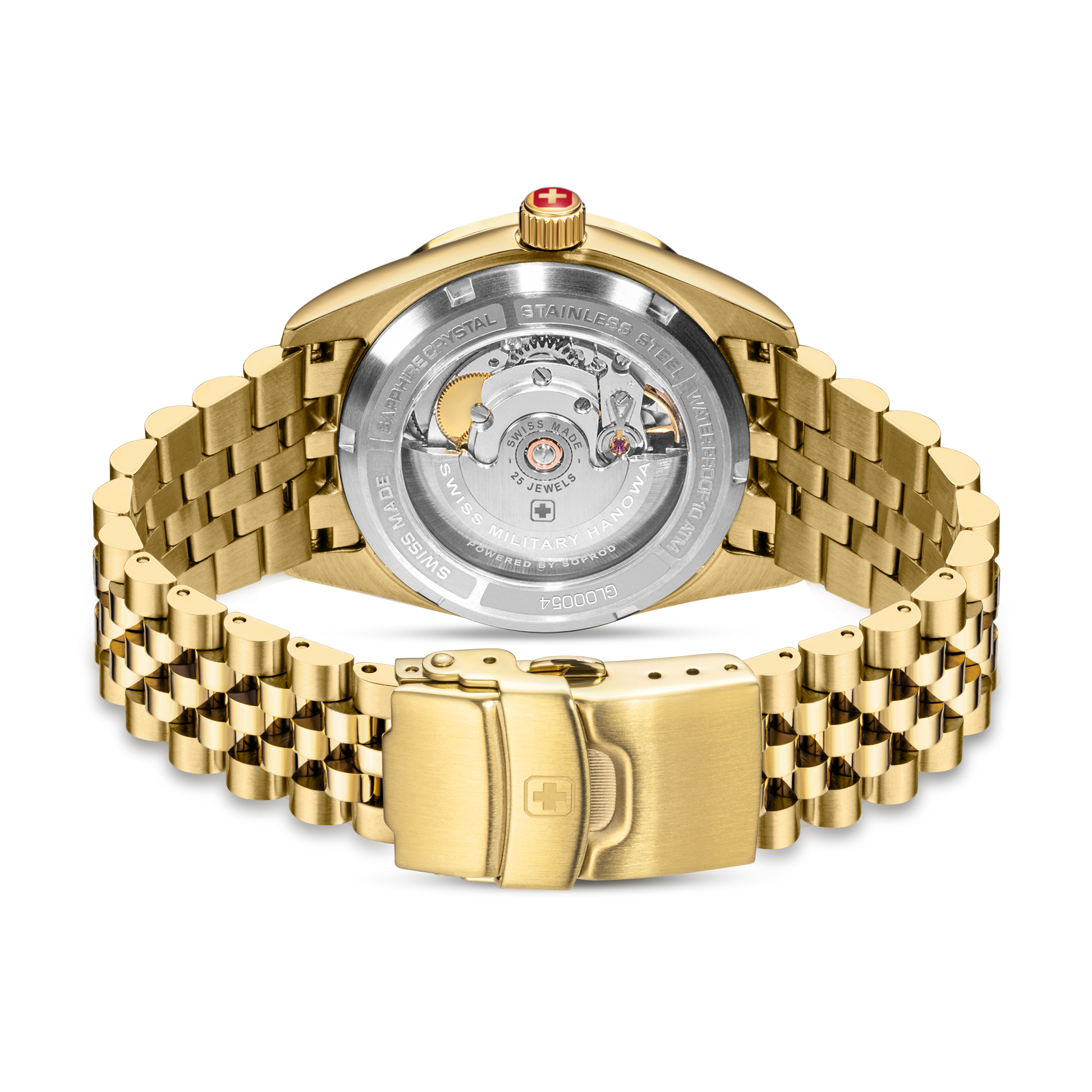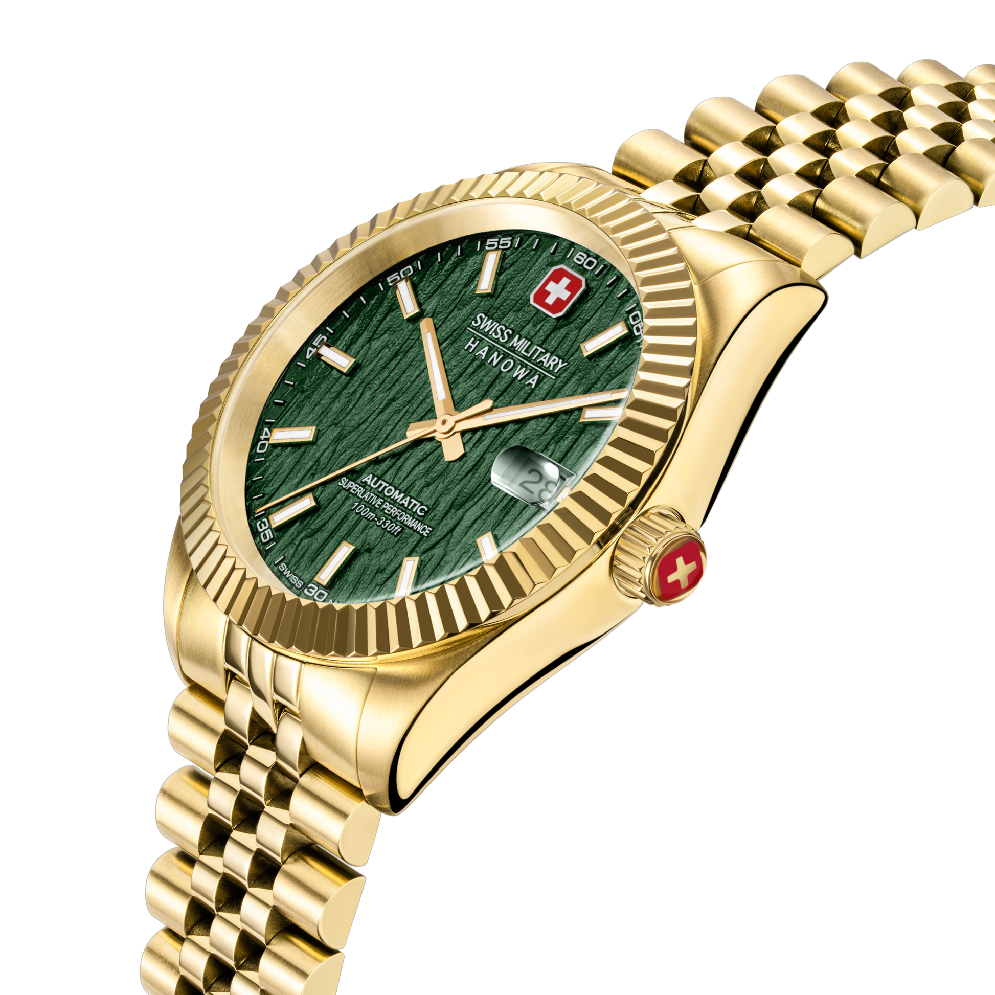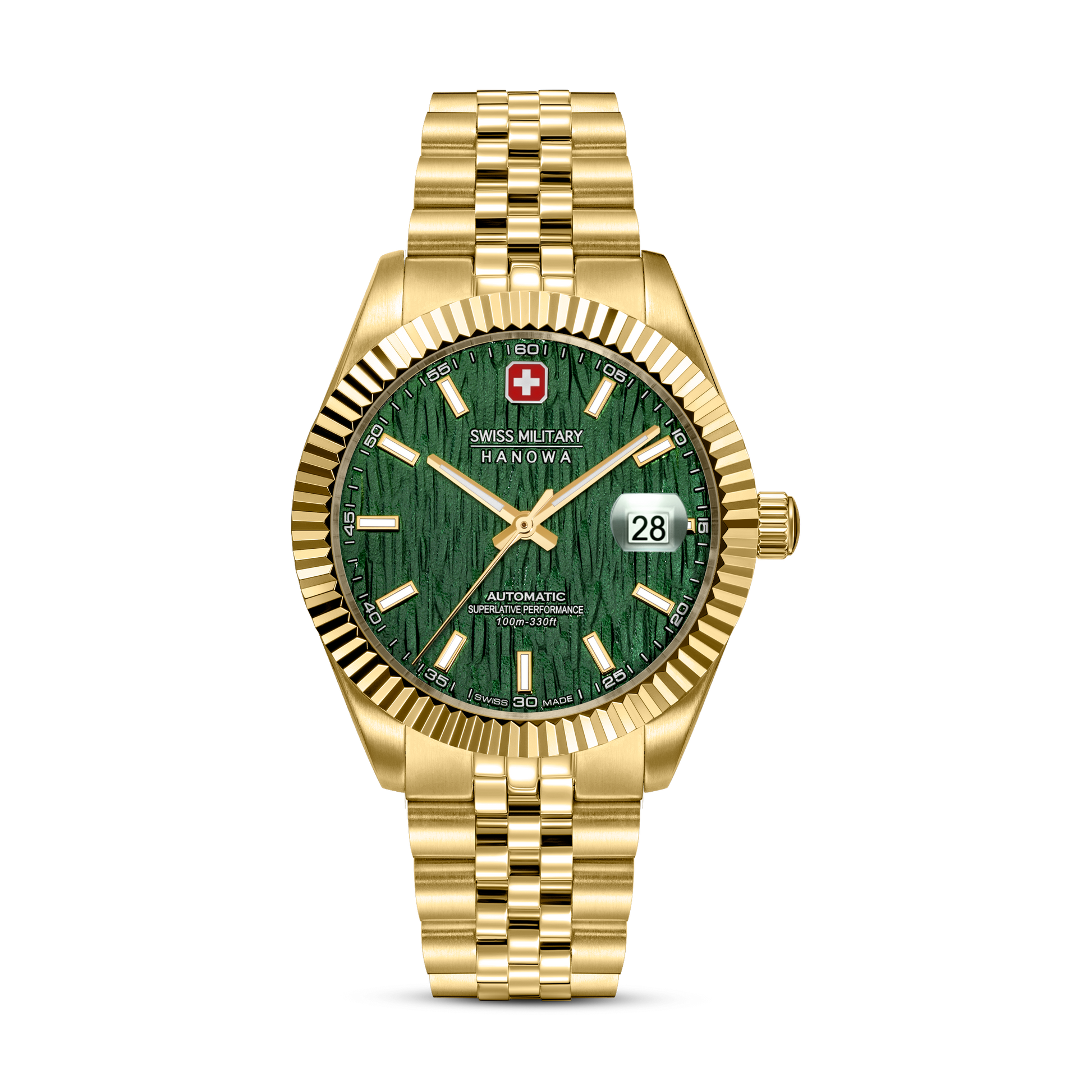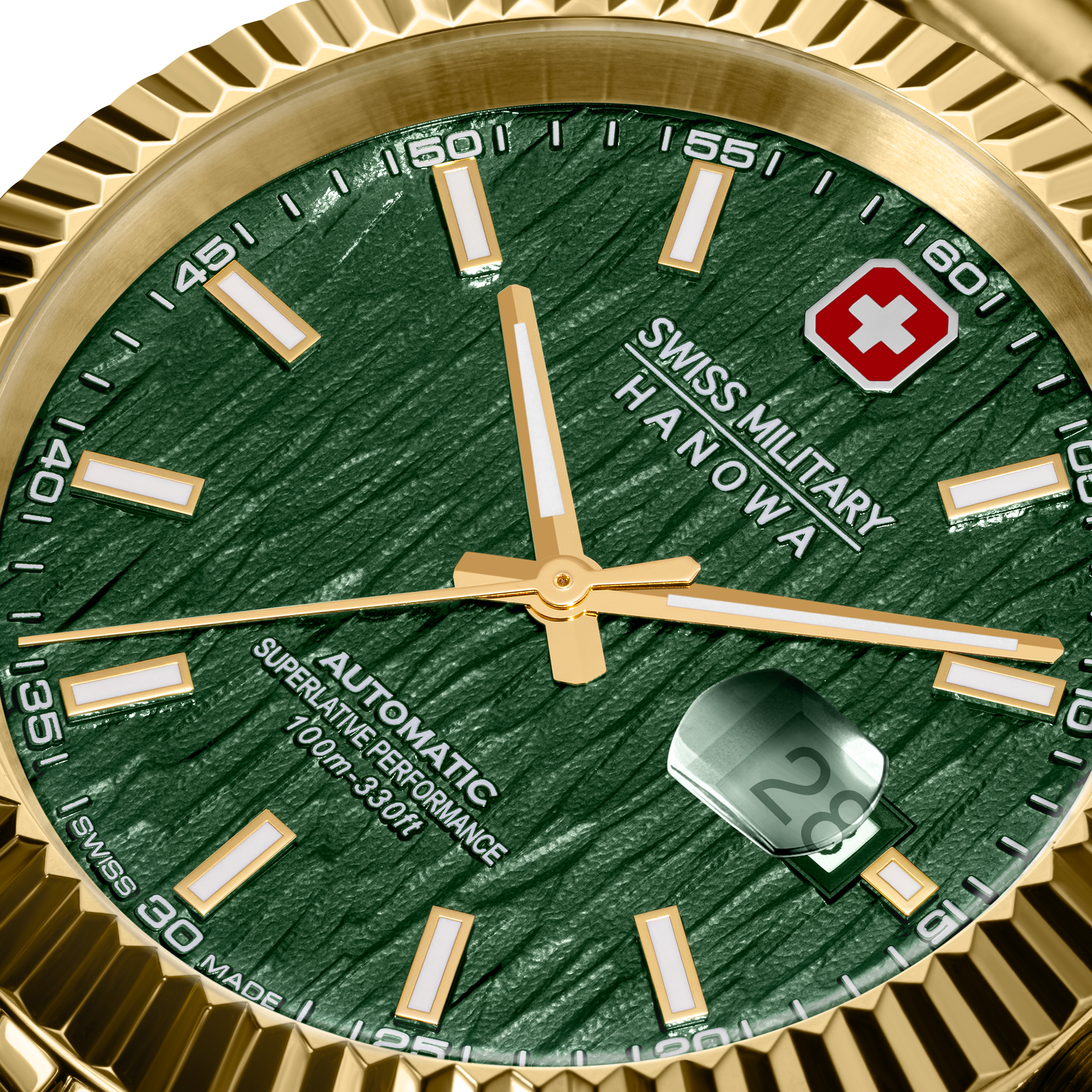 A fresh take on timeless elegance: Swiss Military Hanowa's Master Diligenter. This 41mm automatic timepiece features a sleek case with a fluted bezel, water-resistant up to 100 meters. Its textured silver dial captivates the eye, with a magnifying lens at 3 o’clock for easy date reading. Paired with a durable bracelet, this watch perfectly blends sophistication and performance.